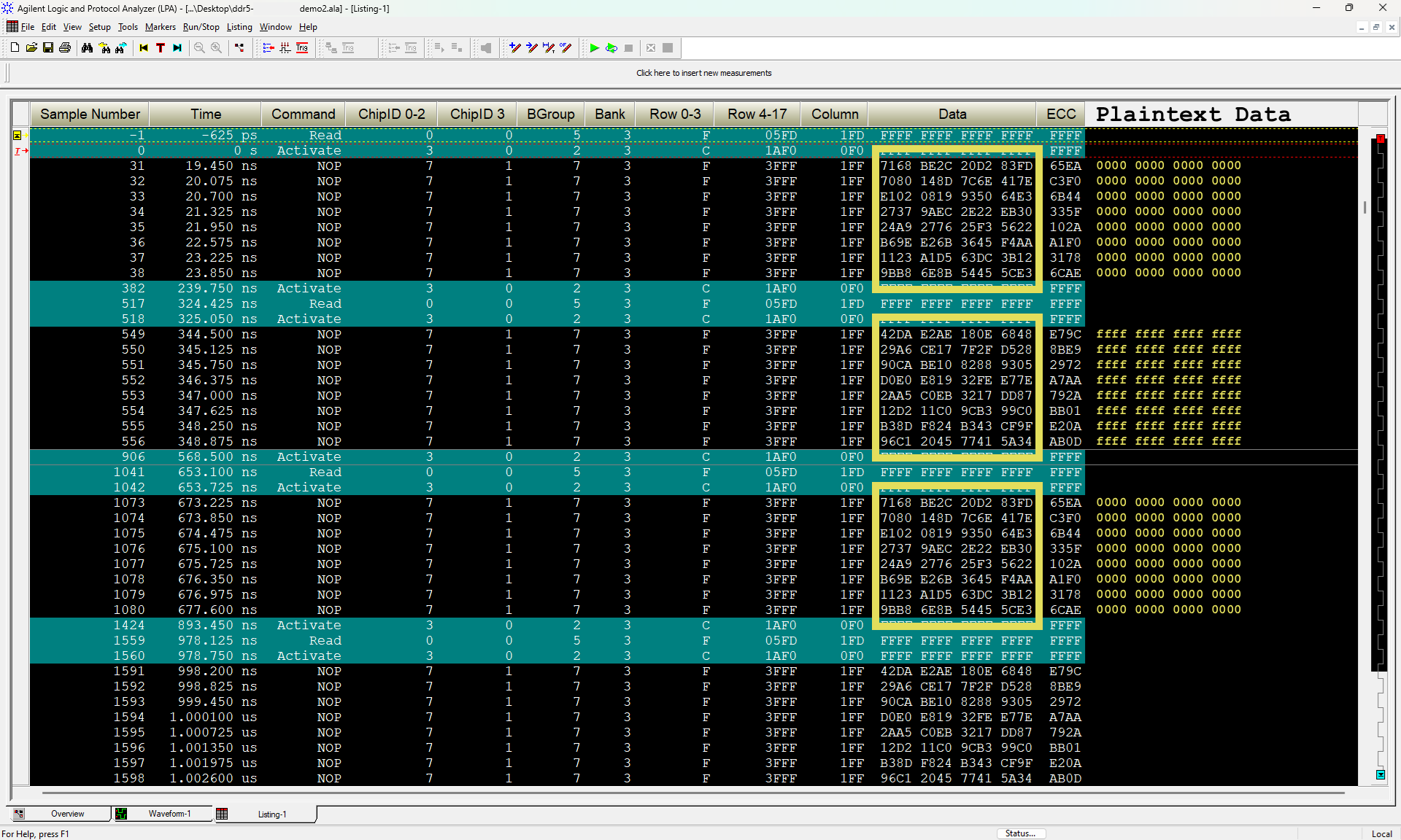 While TEEs do encrypt their data, we show that the encryption mode used by Intel and AMD is not sufficient to prevent physical memory interposition attacks. The photo below shows a DDR5-based TDX machine performing three write operations. The first writes zeros to memory, the second writes ones, and the third writes zeros again. While the data itself is encrypted, notice how the values written by the first and third operation are the same. This is called deterministic encryption and forms the basis of our attack, as we can compare blocks of encrypted data and learn if the underlying data is equal or not.
