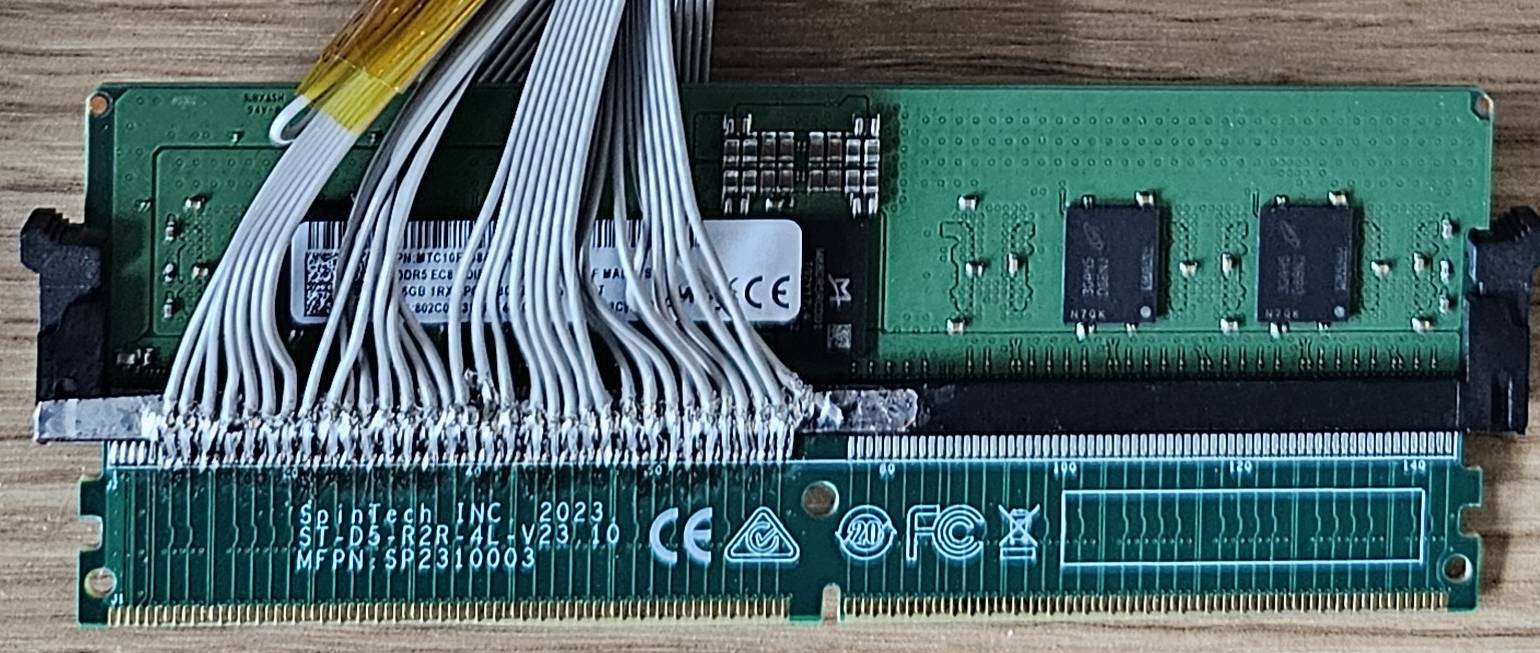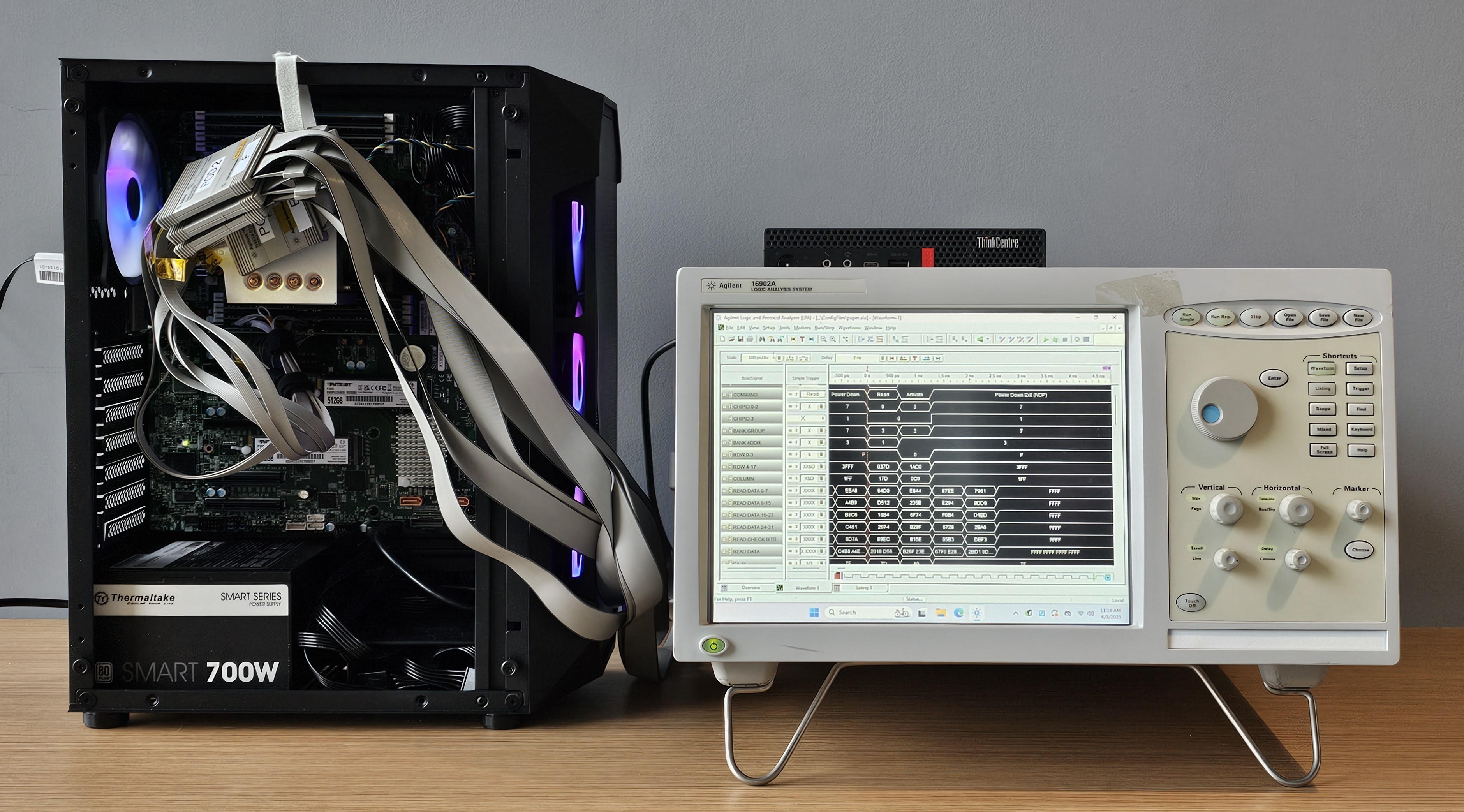 We use our DDR5 DRAM Bus interposer to observe memory transactions, showing reads and writes to plain and encrypted memory alike. On the left is our DDR5 interposer device, soldered by hand. On the right is our target setup with the interposer attached to a DDR5-based target machine running TDX.