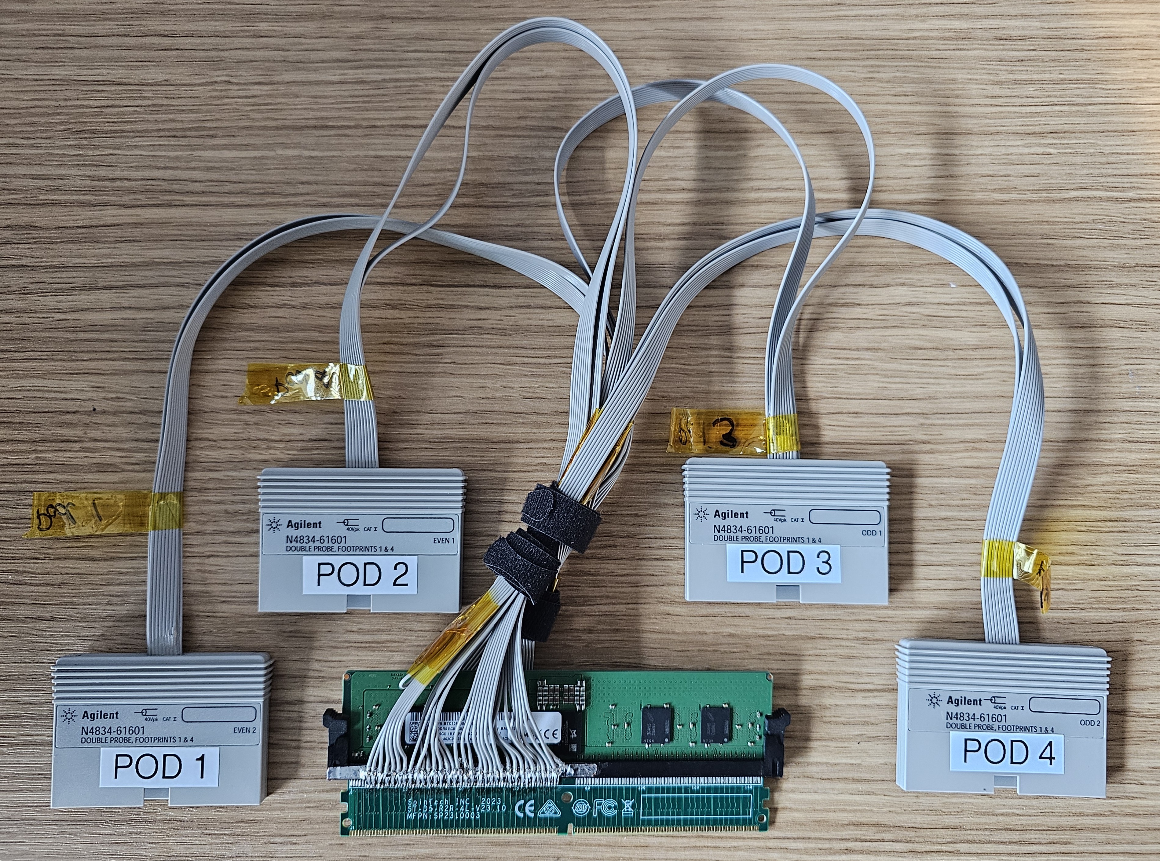 Unlike the older DDR4 standard, DDR5 memory has two independent channels on a single DIMM. Bascially DDR5 has two independent DIMMs in one memory module. As we only need one channel to mount our attack, we opted to go with Channel A (left in the picture above) leaving the other side unmodified. Ironically, it means that DDR5 interposers are easier to build than their DDR4 counterparts, as only 50% of the soldering work is required. Likewise, they also need 50% less input channels to capture their traffic which means less logic analyzer hardware is required.