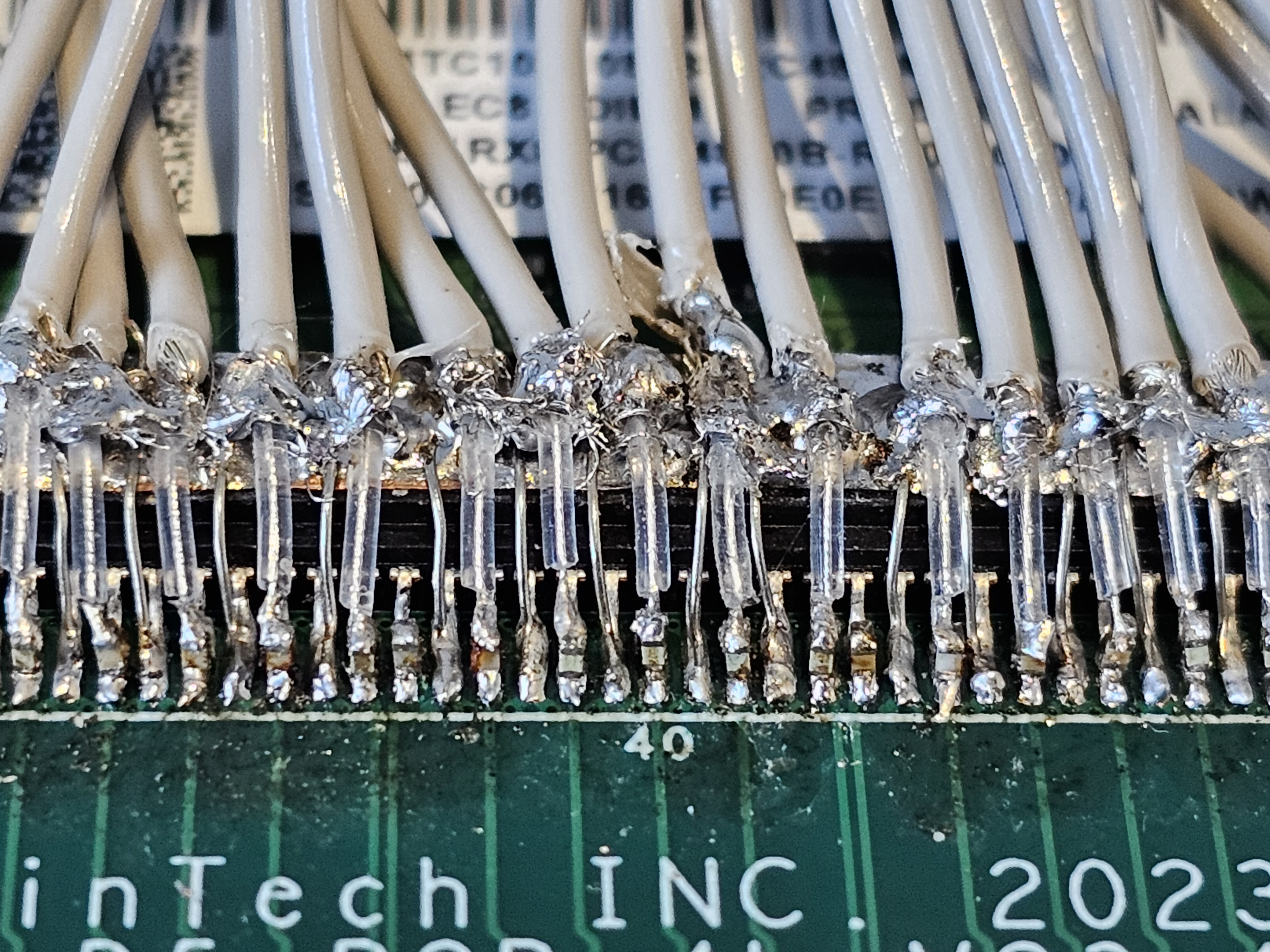 Sure. The photo to the left is the interposer itself, where the logic analyzer connects to the square gray pods. The photo on the right focuses on the soldering itself, showing the components for the probe isolation network used on each pin.